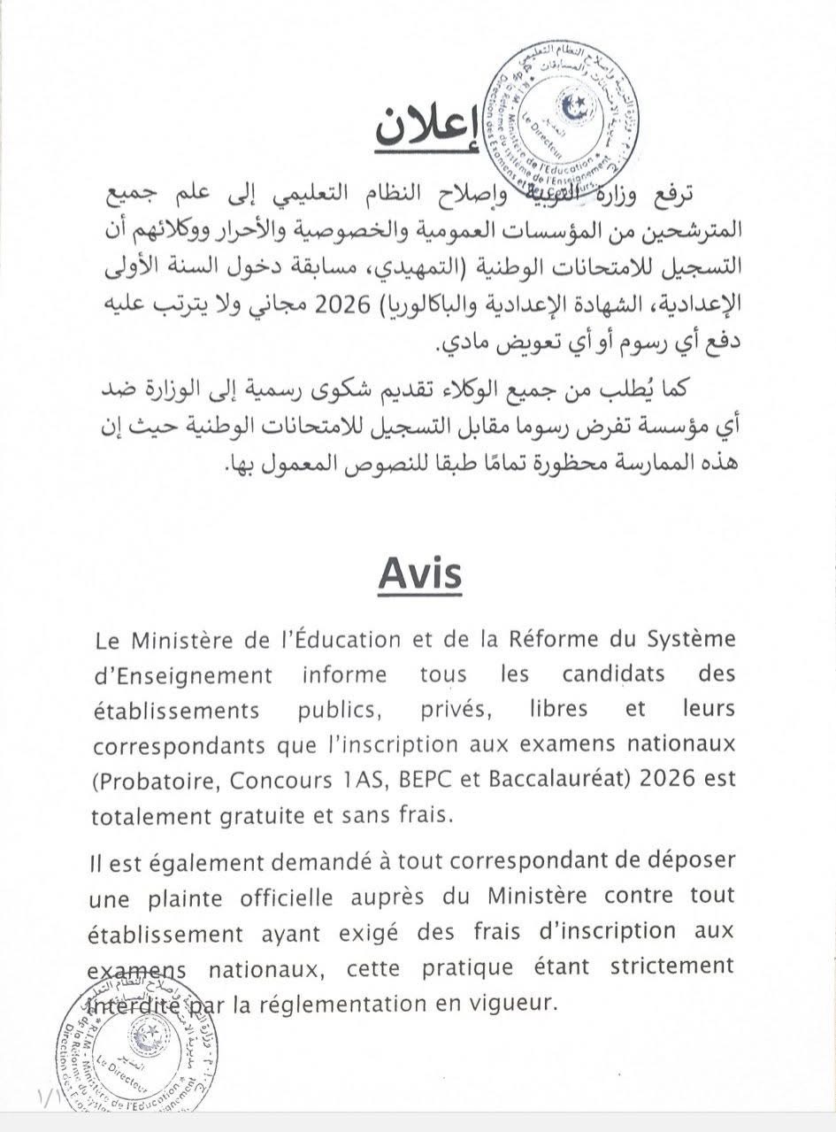 وزارة التربية وإصلاح نظام التعليم تحظر أخذ الرسوم مقابل دفع الملفات للمسابقات الوطنية