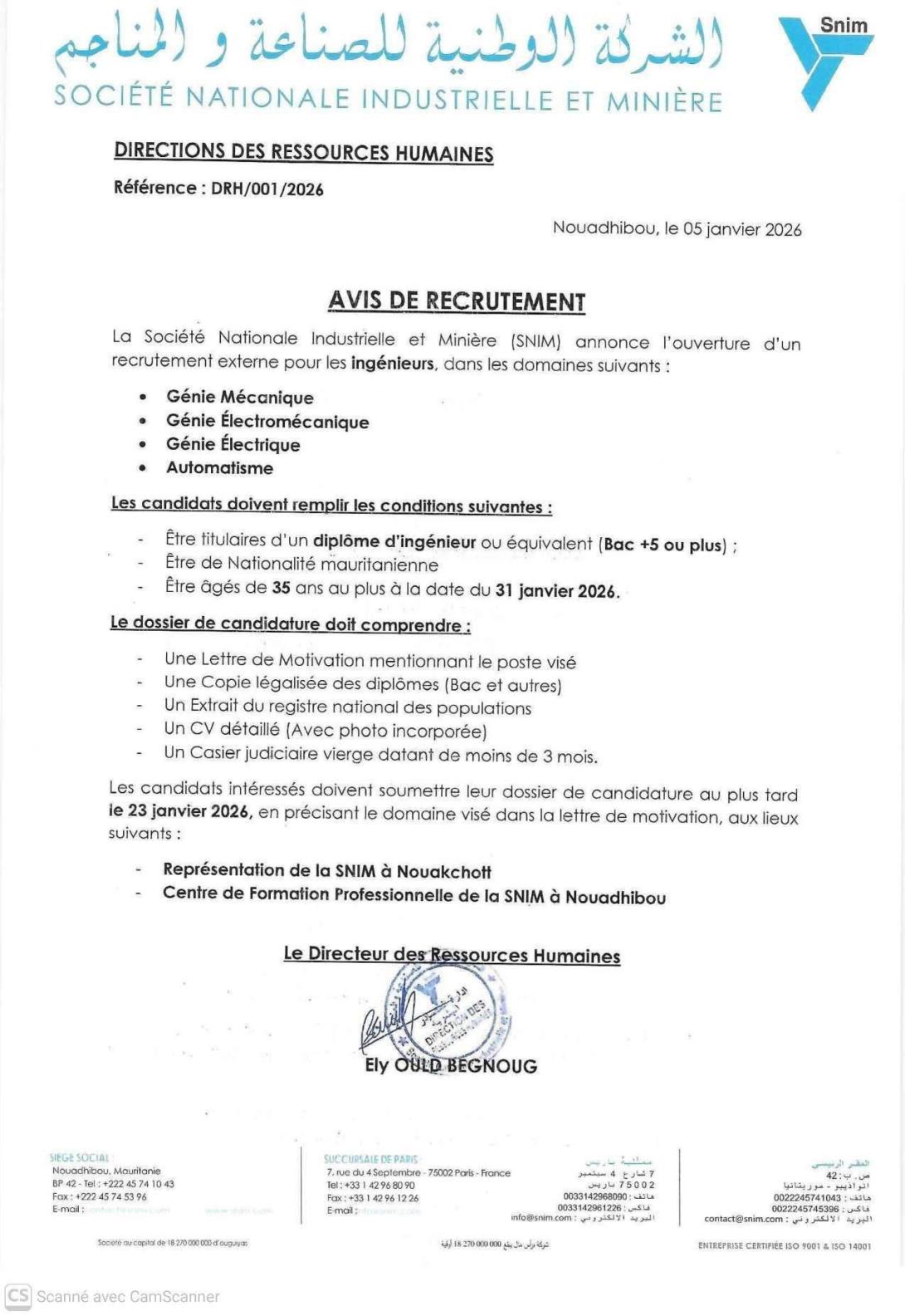 تعلن الشركة الوطنية للصناعة والمناجم سنيم عن فتح باب لأكتتاب خارجي للمهندسين للتخصصات التالية :